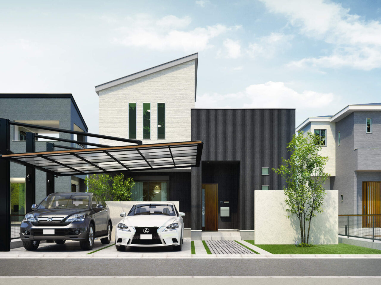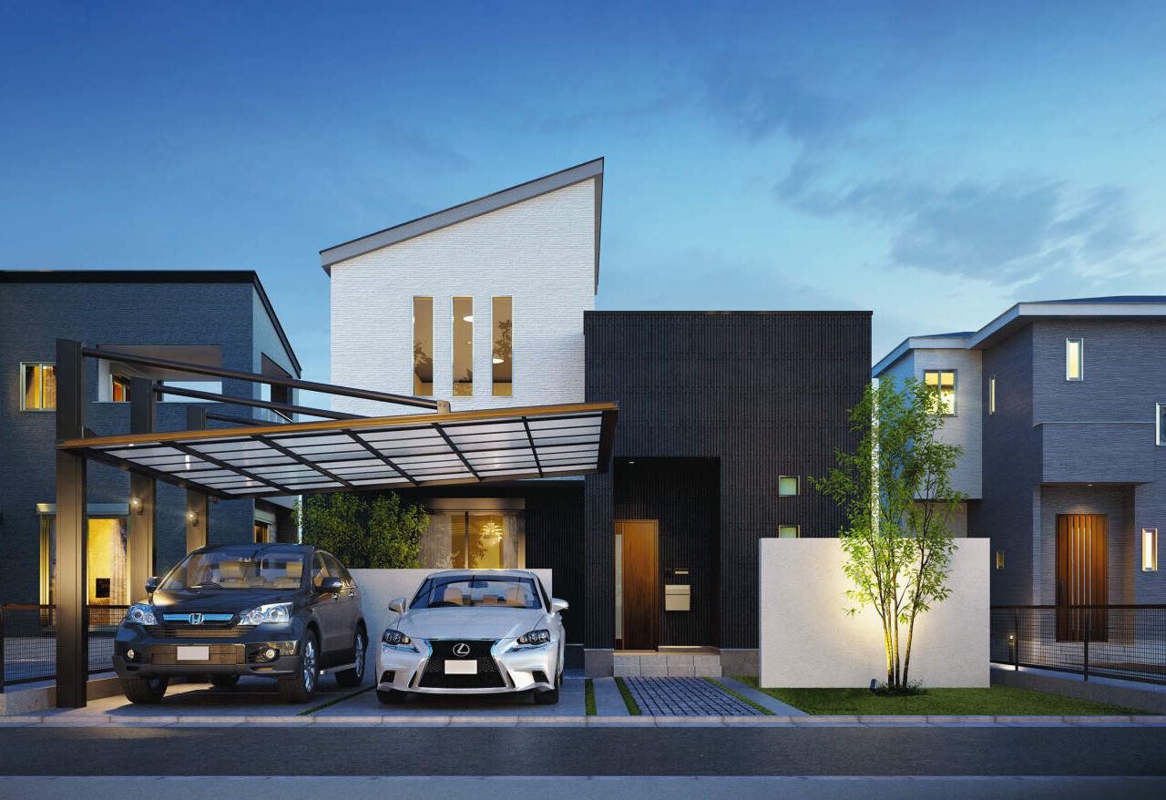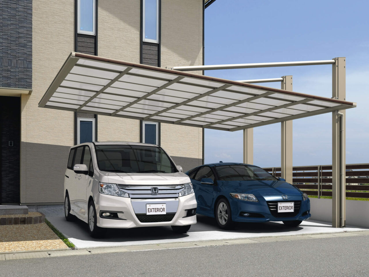 設置条件に応じて柱の位置を2タイプから選べる”ダブルフェース”なカーポート。3本の強靱な柱とアームで屋根をしっかり支える上吊りタイプでダイナミックなデザインが魅力です。2台駐車に対応するワイドタイプで片側支持を実現しました。