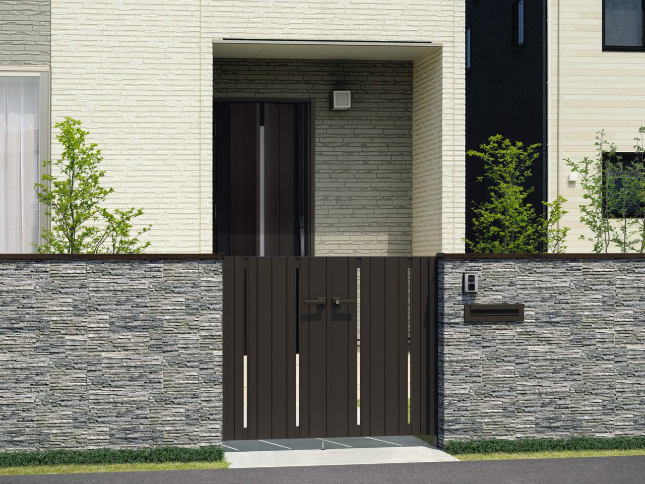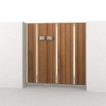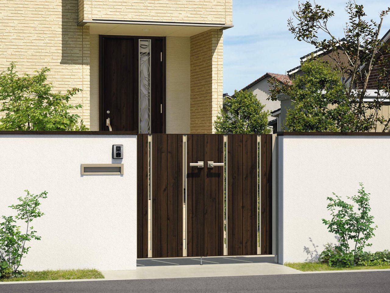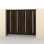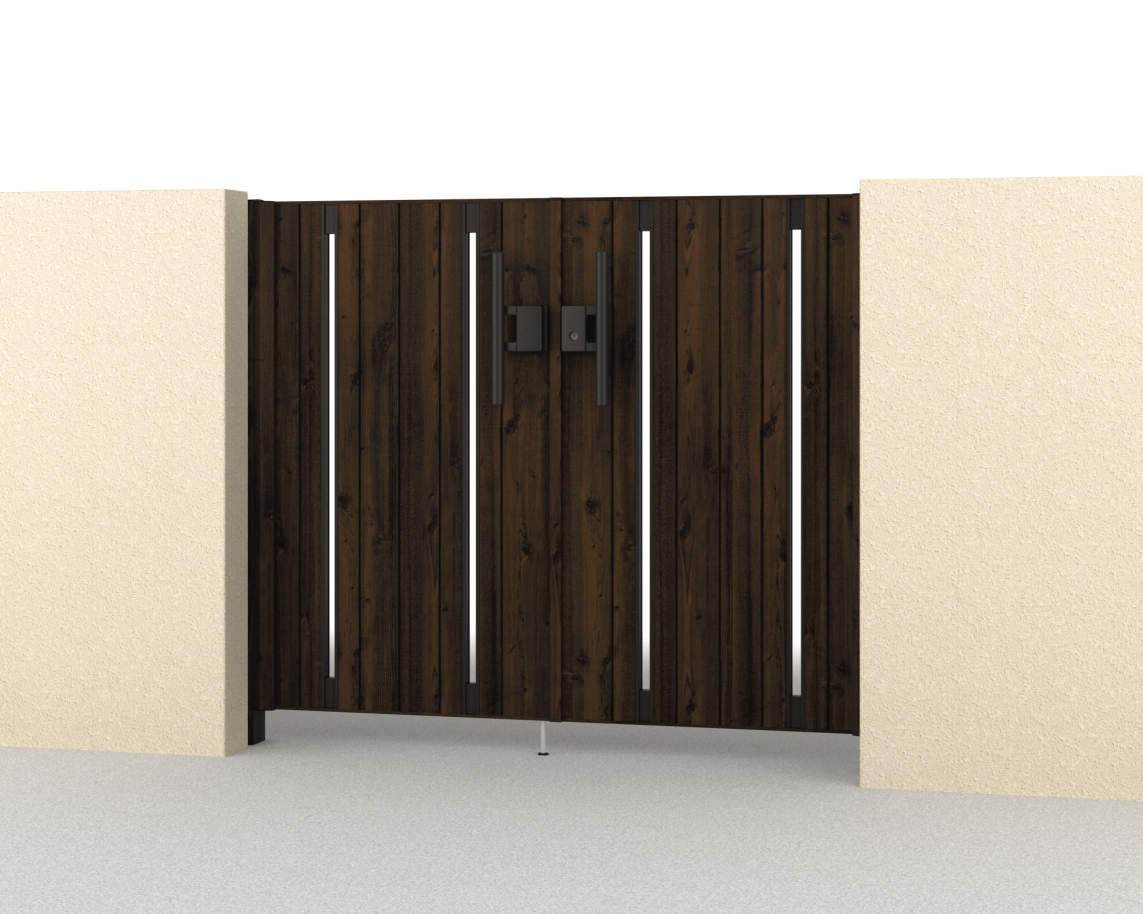 扉・上端部・上桟部・たて框・すき間ガードまですべて木調色で合わせた高級感のある意匠です。細部にも木目の風合いが感じられる門扉です。