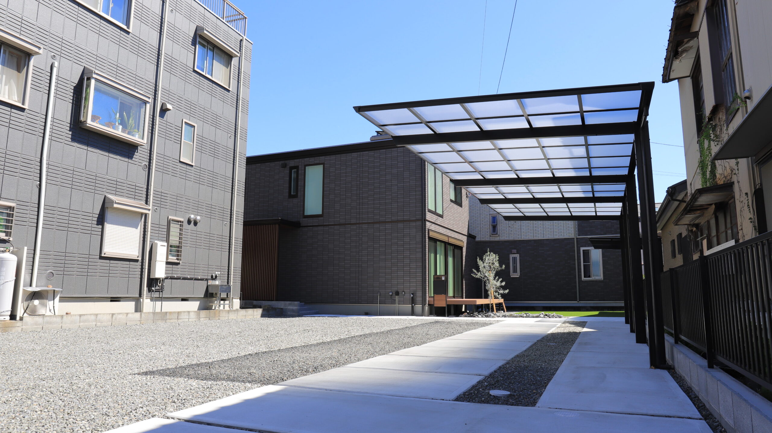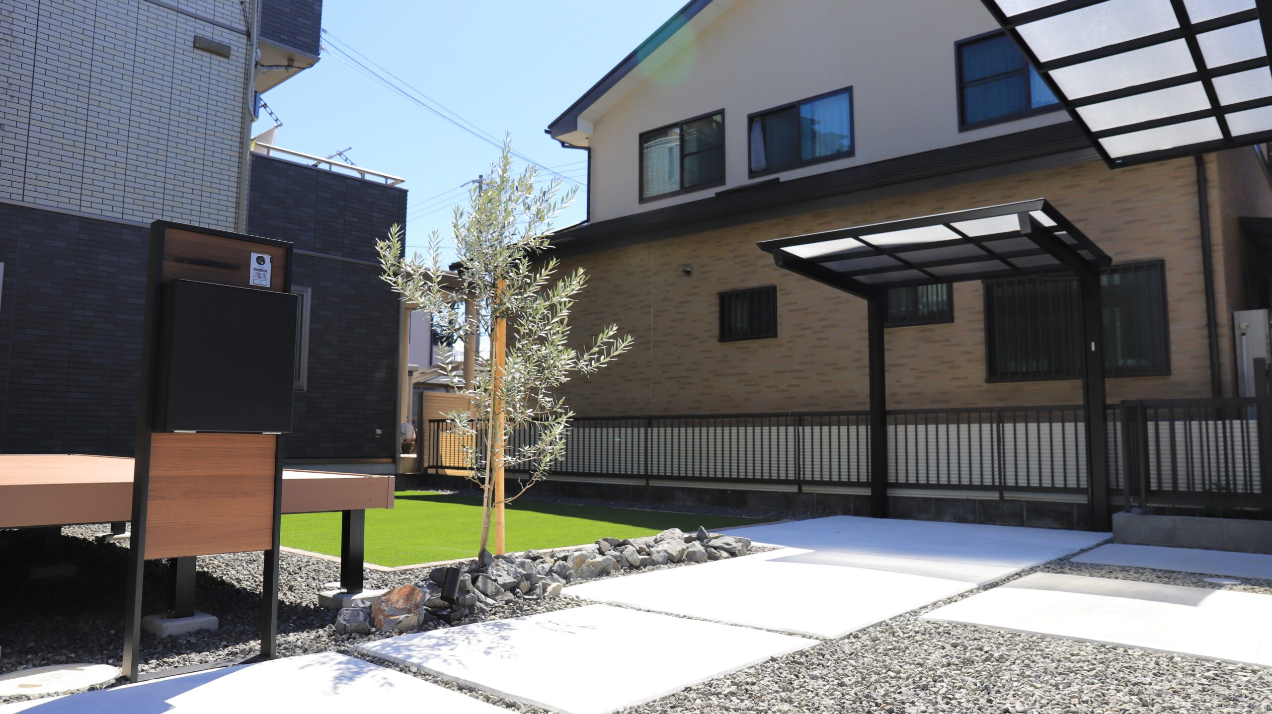通路を兼ねた駐車スペースは、アプローチとしても機能するデザインとし、アイストップにはデザイン性のある機能門柱を配置。シンボルツリーとゴロタ石を組み合わせたドライガーデンが、お洒落な雰囲気を演出しています。さらに人工芝と樹脂デッキを設けたお庭が、ご家族がゆったりと過ごせる庭空間となっています。機能性とデザイン性を兼ね備えた、素敵なエクステリアとなりました。